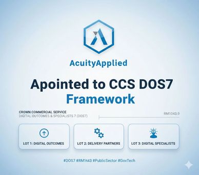 We’re pleased to share that Acuity Applied has been appointed to the Crown Commercial Service Digital Outcomes and Specialists 7 (DOS7) framework (RM1043.9) — a key route for UK public sector organisations to access trusted digital delivery and specialist expertise.
